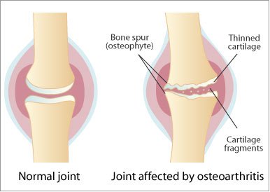 Osteoarthritis occurs when the cartilage gets damaged and it becomes thinner and rougher a bit like rust. It is the bodies healing process that causes problems when the underlying bone tries to repair the cartilage and outgrows, changing the shape of the joint and causing the two main symptoms of OA, pain and stiffness. When we are inactive the synovial fluid can leak out of the joint space adding to the potential for damage. Therefore, the less we move the stiffer we get.