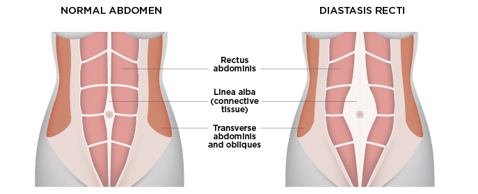During pregnancy, the rectus abdominal muscles that runs down the center of your abdomen becomes stretched and can weaken and even separate, this is referred to as diastasis recti. The amount of separation can vary in women, due to the size of your bump, and weight gain in pregnancy. The chances of diastasis recti are increased by substantial weight gain during pregnancy or by a twin pregnancy. In fact, 3 in 10 women will suffer from a mild form of diastasis following their first pregnancy. In addition, the likelihood of diastasis and the size of it increases after multiple pregnancies.
